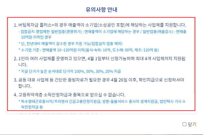 유의사항을 보면 다수 사업체를 운영하고 있는 소상공인의 경우에는 4월 1일부터 신청이 가능하다는 걸 알 수 있고, 공동사업자의 경우에도 4월 26일 이후 신청이 가능함을 알 수 있습니다. 공동사업자의 경우에는 증빙자료가 필요할 수도 있습니다.