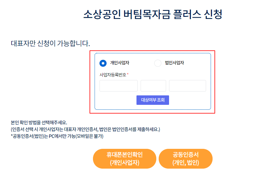 소상공인 버팀목자금 플러스는 대표자만 신청이 가능하고 공동인증서가 필요합니다. 사업자등록번호를 넣고 대상 여부 조회를 누르면 대상인지 아닌지 알 수 있습니다.