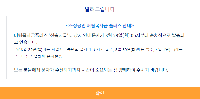 단, 29일은 사업자등록번호가 홀수인 사업체들 대상으로 오전6시부터 지원대상자들에게 문자가 발송이 되었고 내일 30일에는 사업자등록번호가 짝수인 사업체들 지원대상자들에게 문자 발송 예정이다. 따라서 홀수와 짝수에 맞게 소상공인 버팀목자금 플러스 신청 사이트에 들어가서 직접 신청하면 되겠습니다.